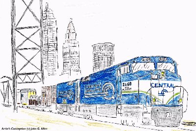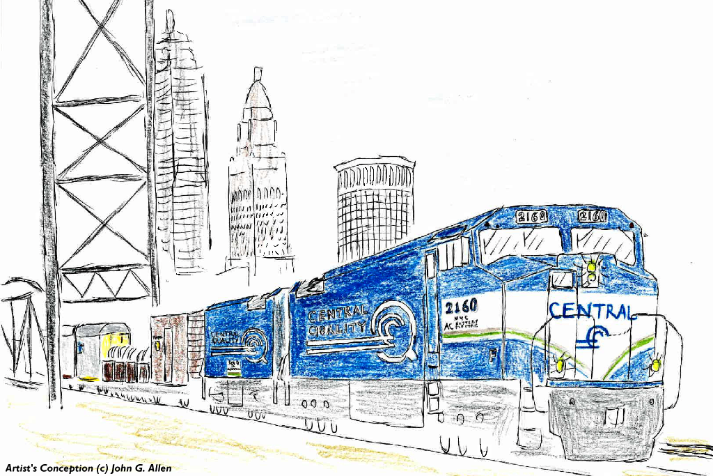 New York Central battery electrics at Cuyahoga River Drawbridge, Cleveland; Artist's Conception by J.G. Allen.